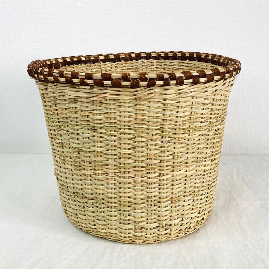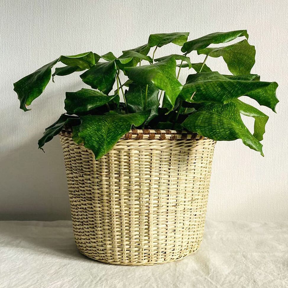 しなやかな天然素材Marrabous Palmと現地で呼ばれている椰子であみあげたバスケットです。木の皮を縁に施した素朴なデザインです。リネンや雑誌、小物の収納に、ひとつあると大変便利なバスケットですが、観葉植物の鉢カバーとしてもお使いいただけます。写真4枚目は根張り鉢6号を入れたものです。