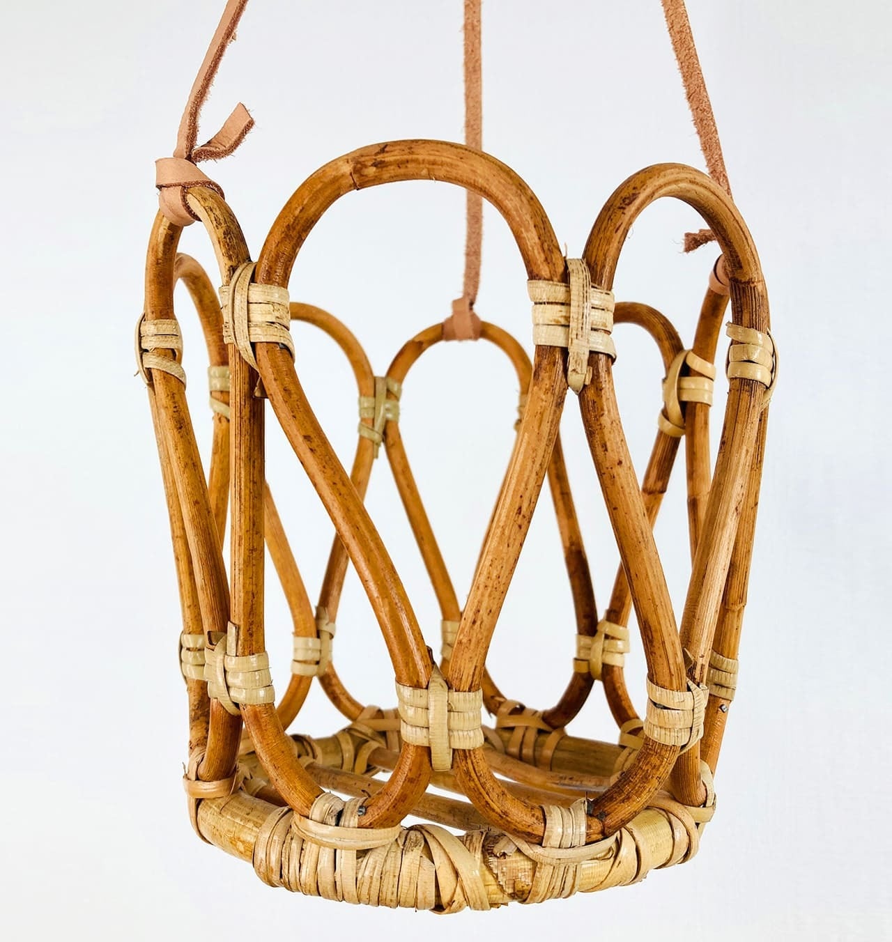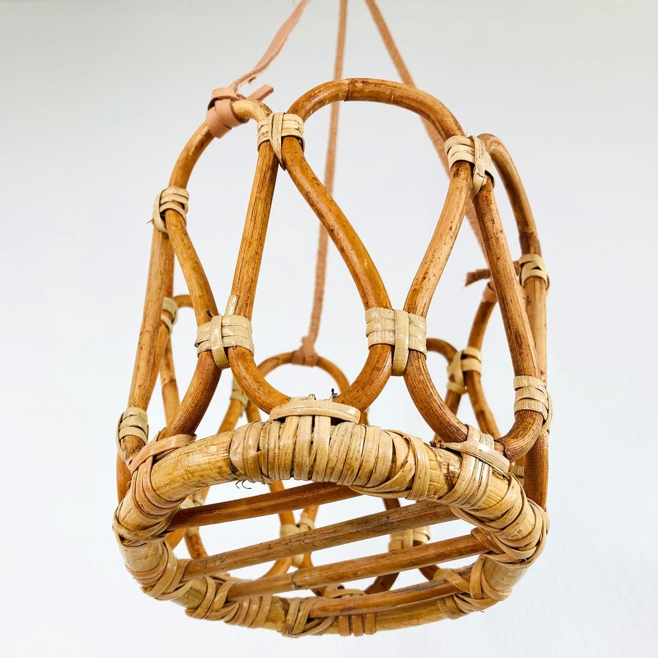 ラタンと本革のレザー紐で作られたハンギングポットです。とても軽いので軽いタイプの物をお探しの方にお勧めします。4合鉢サイズまでの鉢に対応しています。中に入れる鉢のデザインによって印象が変わります、お気に入りの鉢を入れてみても。ラタンと革は経年変化で色味が深まっていくので、色の変化も併せてお楽しみください。