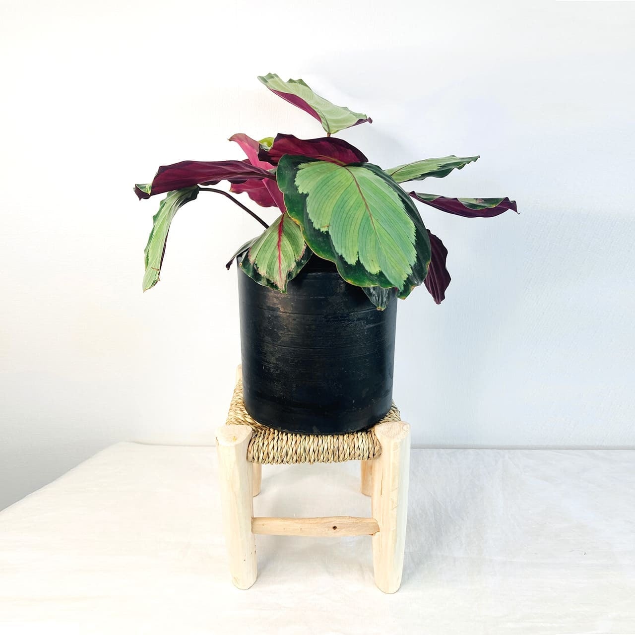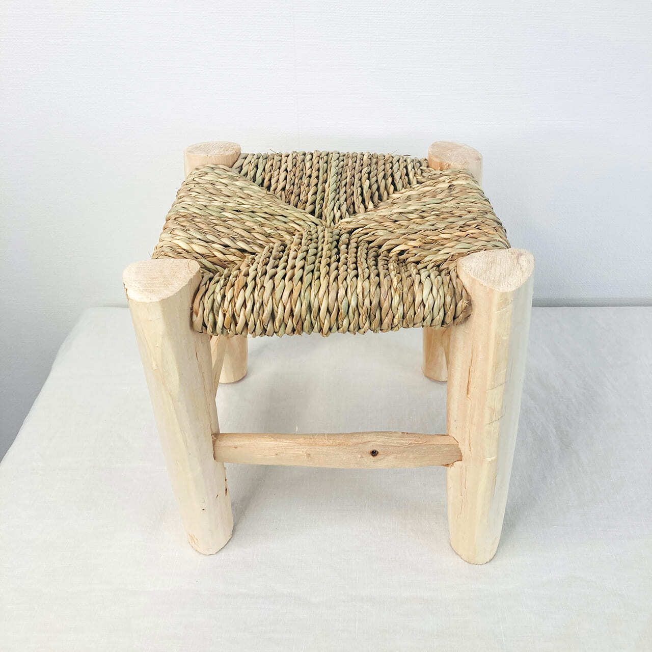 観葉植物を置く、プラントスタンドに丁度良いサイズです。座面の椰子の葉は、モロッコの熟練した職人によって手作業で丁寧に編まれており、自然素材の美しさと上品さが引き立っています。とてもシンプルなデザインなので、どんな部屋にも洗練されたアクセントを加え、観葉植物やナチュラルなインテリアとの相性も抜群です。